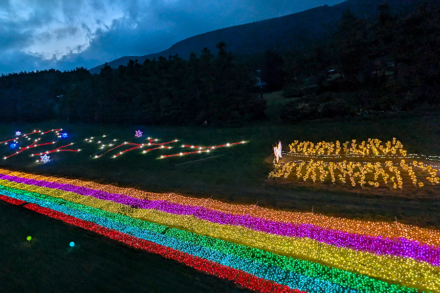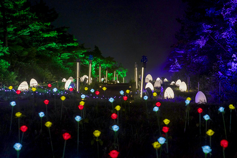 あだたら高原スキー場の斜面に沿ってちりばめられた天の川と安達太良山に咲く花をモチーフにしたイルミネーションは、満天の星空と相まって幻想的な光景を生み出します。